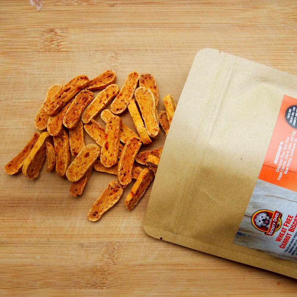 This is the newly improved Carrot Biscotti. Healthier and crunchier. It was hard work peeling carrots but Pet Baker loves...