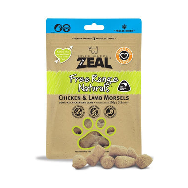 Zeal Free Range Naturals Chicken & Lamb Morsels Freeze-Dried Dog Treats are made from free range meats: 50% New Zealand Chicken and 50% New Zealand Lamb.